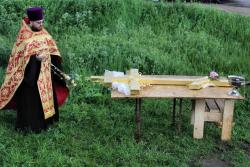 Уже много лет идёт реставрация сильно порушенного Казанского храма. Процесс возрождения святыни не простой, так как храм является объектом культурного наследия и за реставрацией осуществляется государственный надзор. В августе 2015 года по исполнении дорогостоящего проекта, удалось получить разрешение на работы по восстановлению церкви. С этого момента реставрационная организация приступила к работам. Было принято решение начать с колокольни, как с наиболее сохранившейся части храма. В марте 2016 года сняли покосившийся крест, который был выправлен и заново позолочен. А 4 июня в субботу состоялось его торжественное освящение и установка. Не взирая на плохую погоду и сильный ливень на молитве людей было много. Местные жители выходили со своих участков на главную улицу и наблюдали за подъёмом креста. Теперь крест на самой высокой точке – колокольне, блистая своей позолотой свидетельствует о воссоздании святыни и приглашает всех зайти в храм и вознести Богу молитву. | | Крест | Слово перед началом освящения | Во время освящения | | Каждение | Каждение | Каждение | | Хор | Окропление святой водой | Окропление святой водой | | Целование освященного креста | Сергей Сергеевич | Целование освященного креста | | Анна Ивановна | Перед установкой | Подъем креста | |